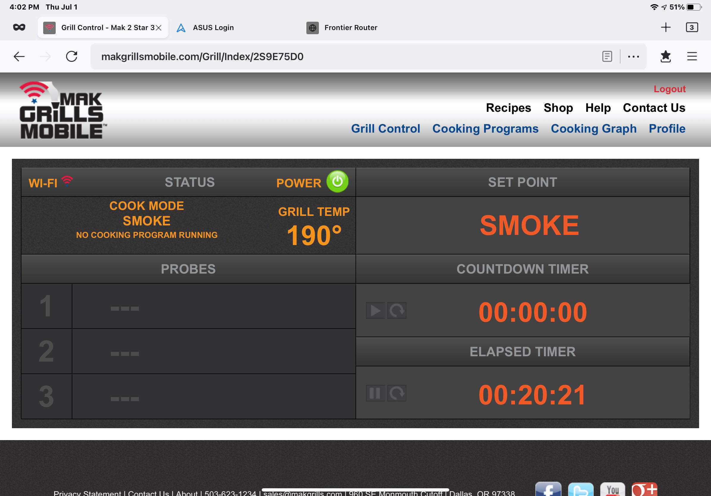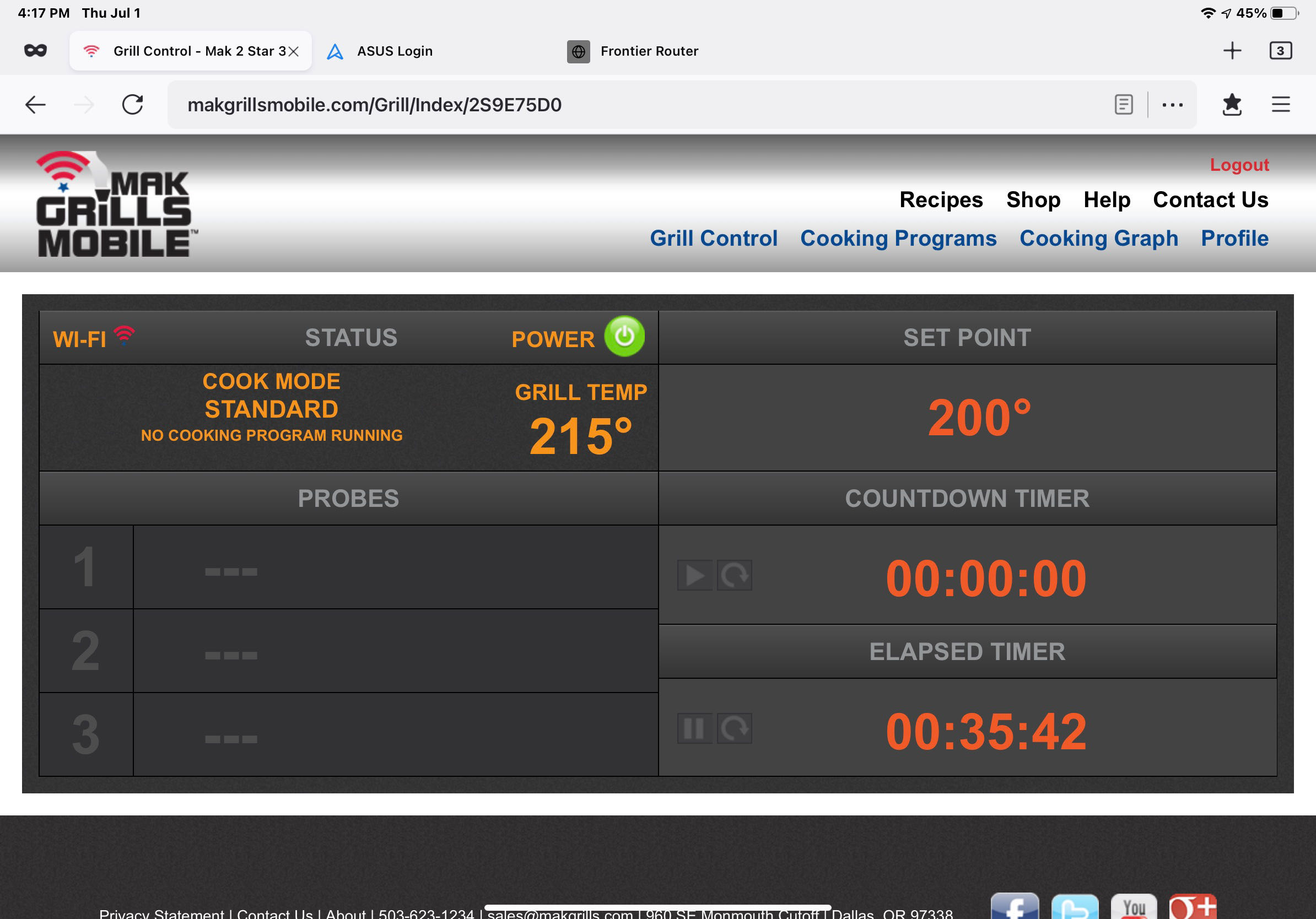 I started the grill and set the temp point to “Smoke” which is below 200° and generates clouds of smoke for your BBQ pleasure. These screen shots are from the MakGrillsMobile web site which is used to control the grill.