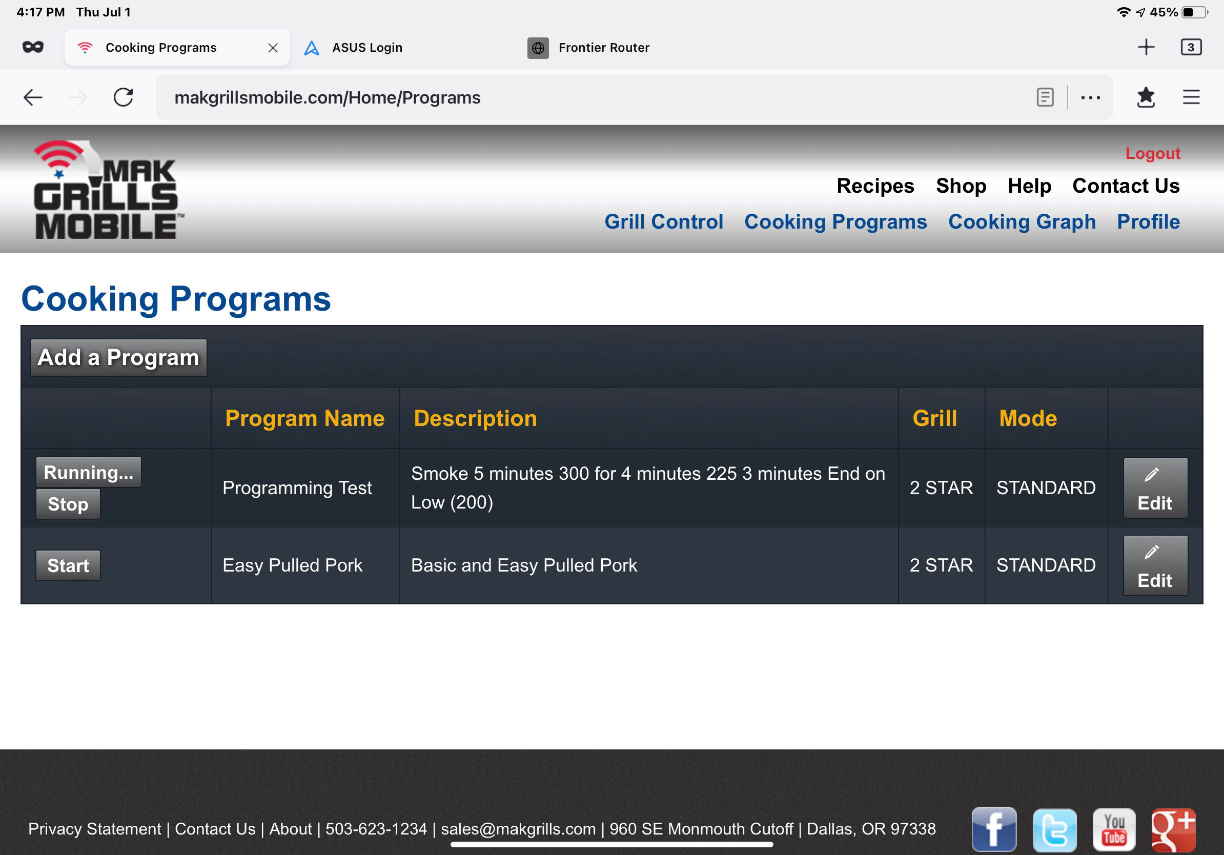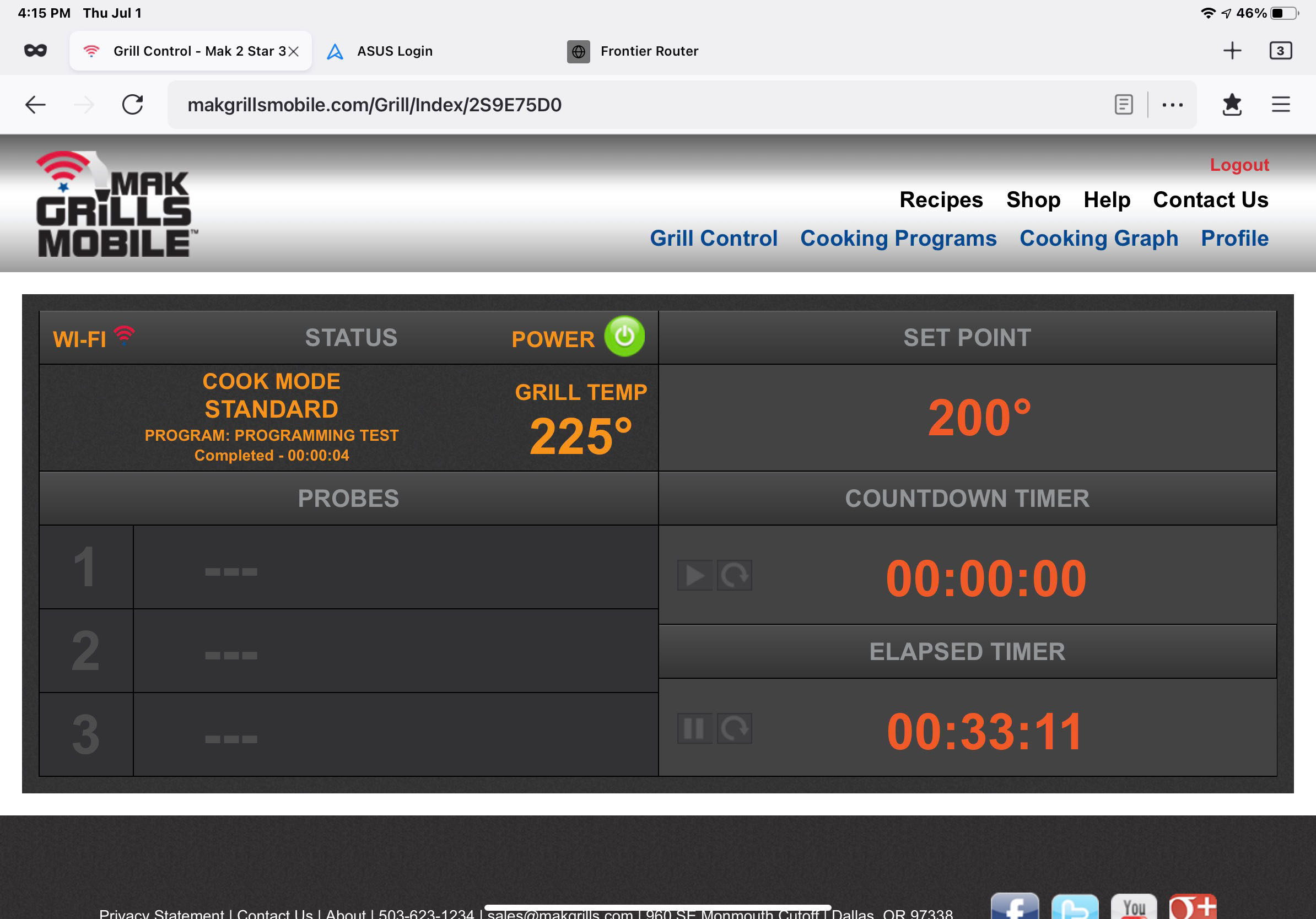 I clicked the “Stop” button on the running program; then went to the main Grill Control page to make sure my Set Point was still at 200°